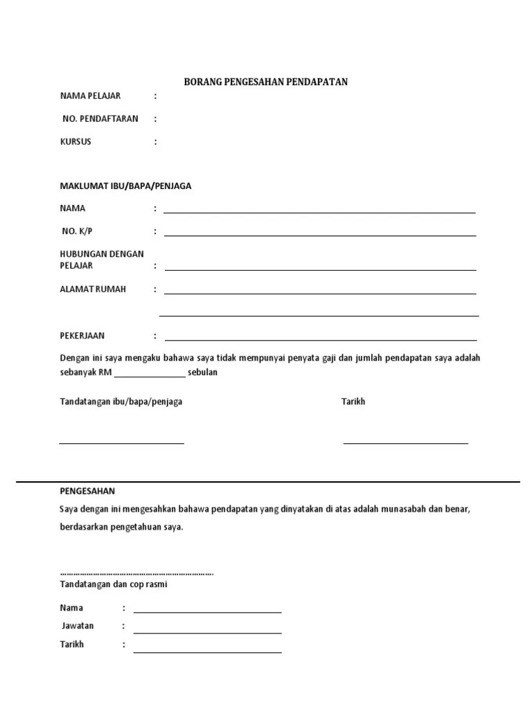 Borang pengesahan pendapatan bagi ibu/bapa/penjaga yang tiada penyata gaji/bekerja sendiri (diisi oleh ibu/bapa/penjaga).